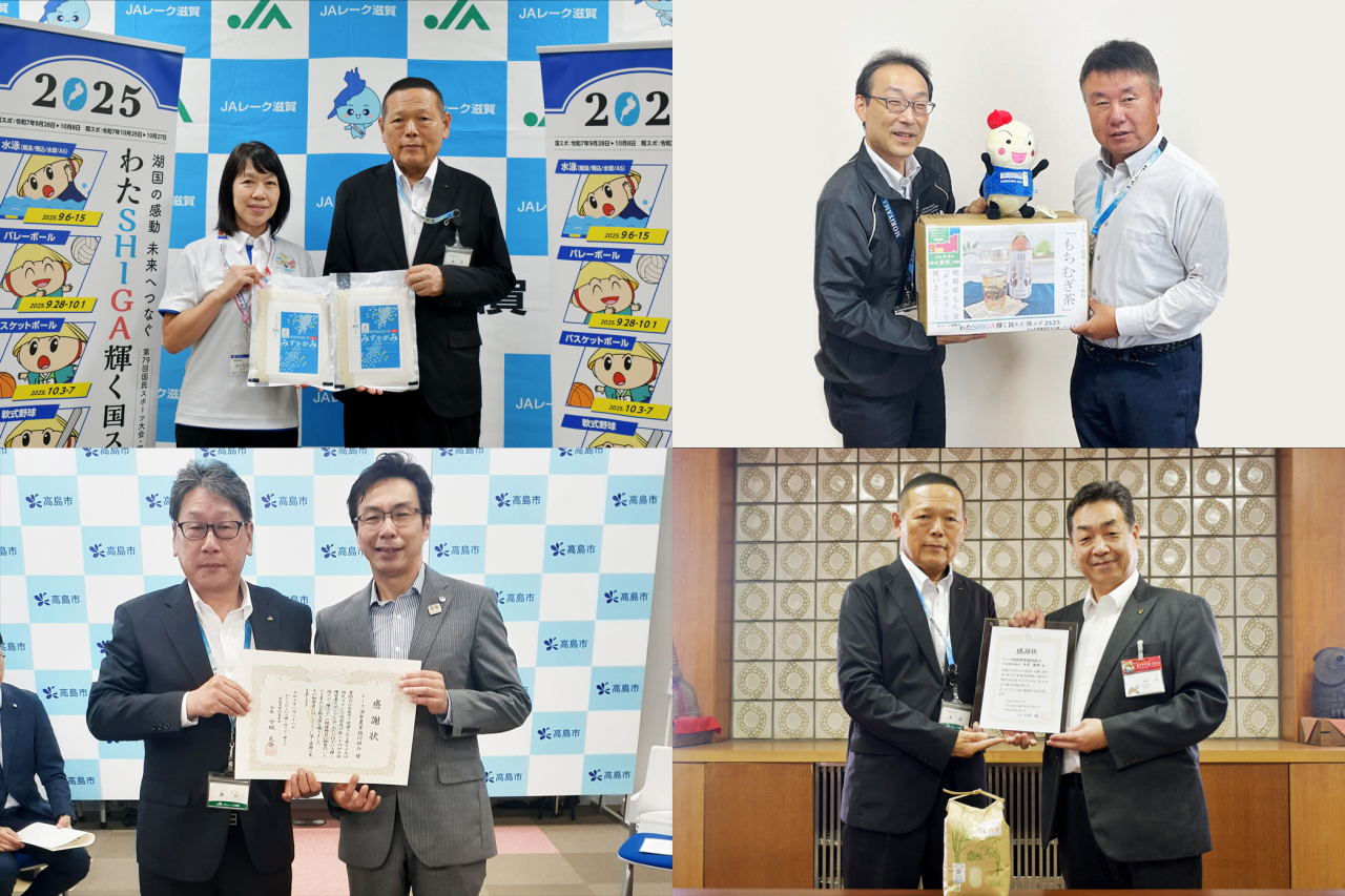 JA共済の地域活性化積立金を活用し「わたSHIGA輝く国スポ・障スポ2025」の高島市、草津市、栗東市、守山市での開催競技応援のため、オリジナルペットボトル飲料「もちむぎ茶」や令和7年産米を協賛提供しました。