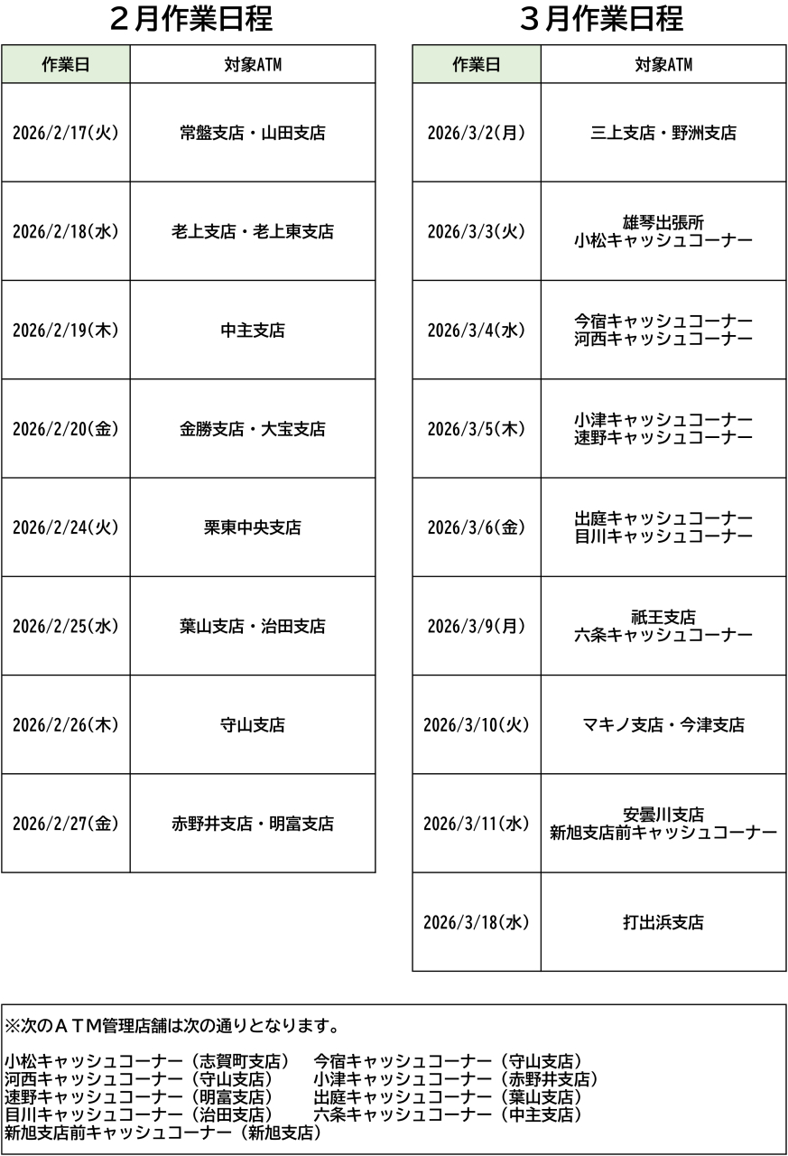 つきましては、作業にあたり、ATMを休止致しますので、皆様にはご不便とご迷惑をお掛け致しますが、ご理解とご協力をお願い致します。