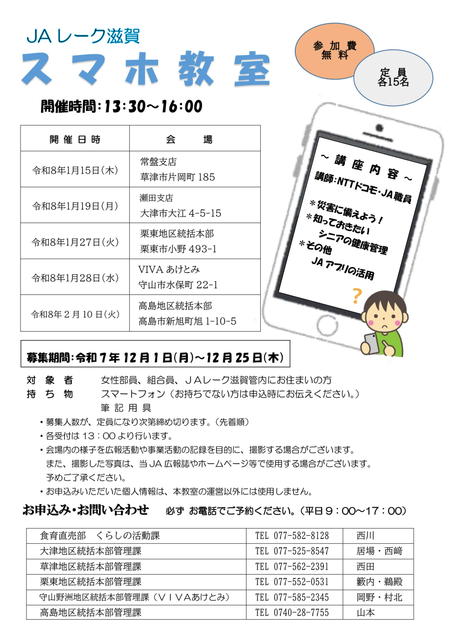 そんなあなたにぴったりの スマホ教室 を、JAでは地域の5つの地区で開催します!