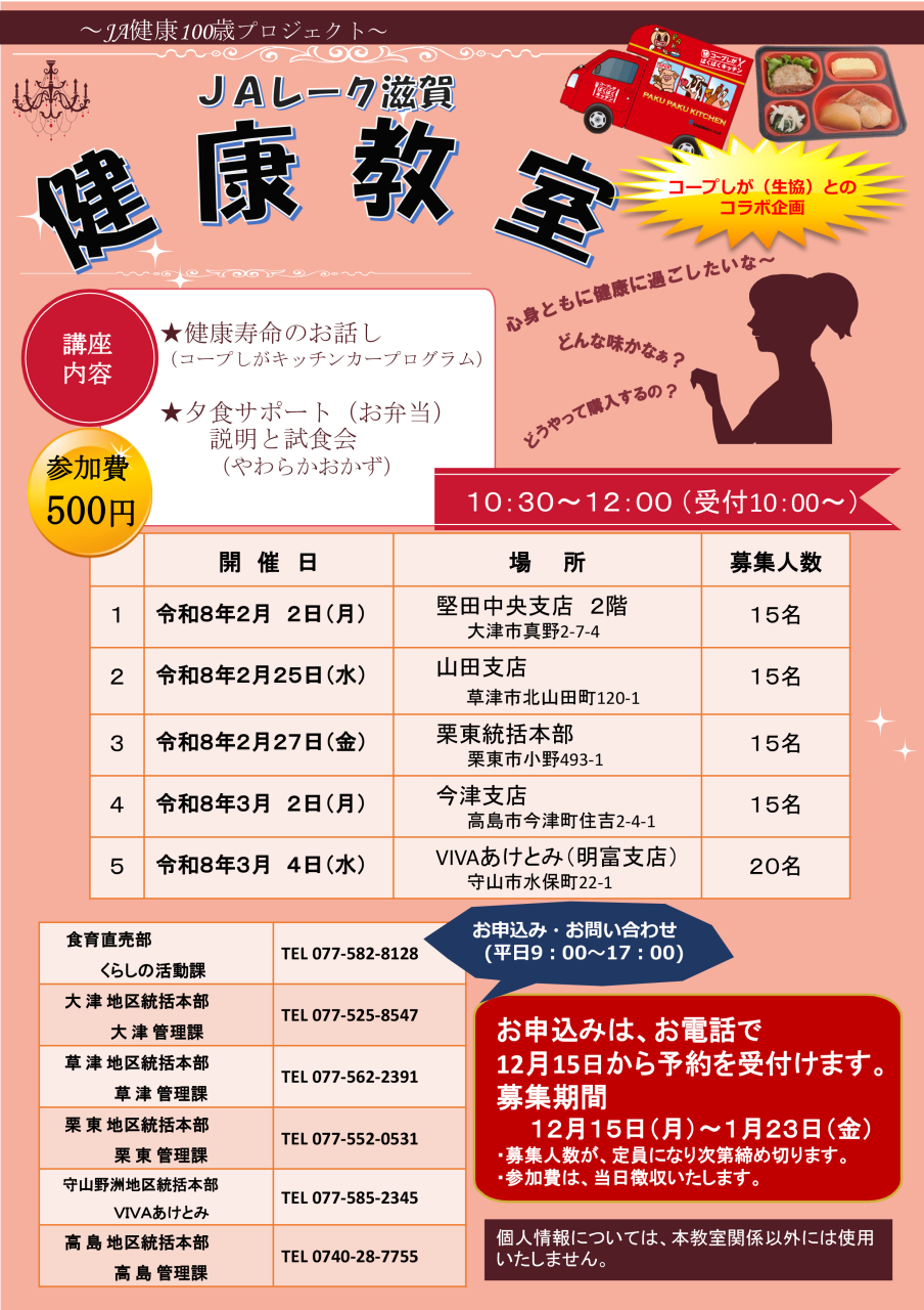 JA健康寿命100歳プロジェクト「健康教室」開催/2月2日(月)~3月4日(水)