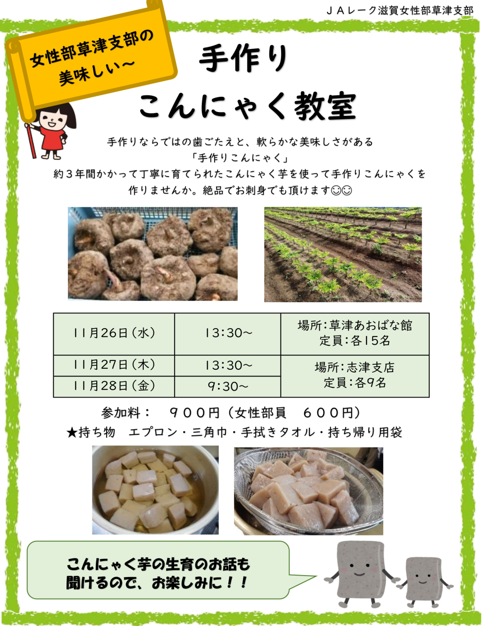 【草津地区】参加者募集!! 手作りこんにゃく教室/11月26日(水)、27日(木)、28日(金)