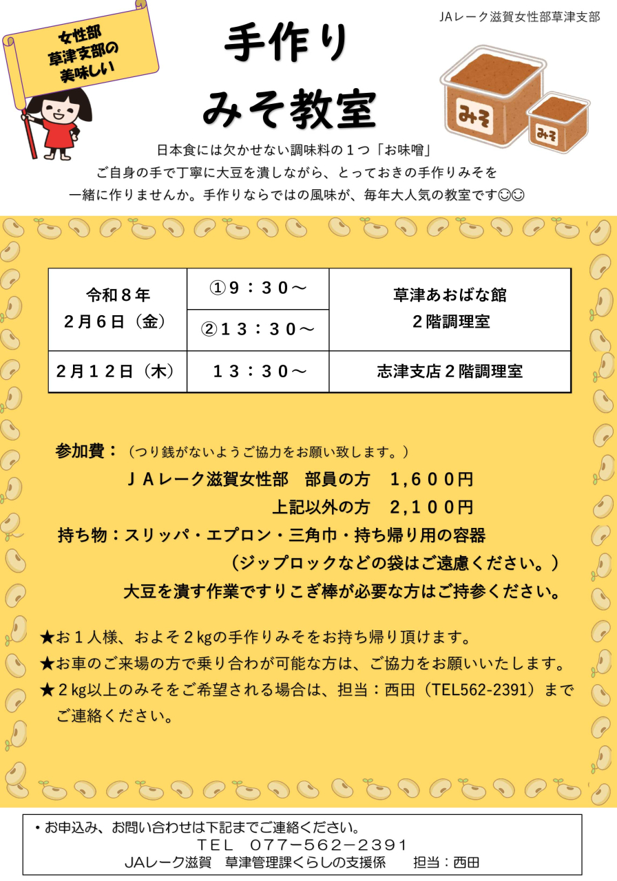 【草津地区】参加者募集!! 手作りみそ教室/2月6日(金)、12日(木)