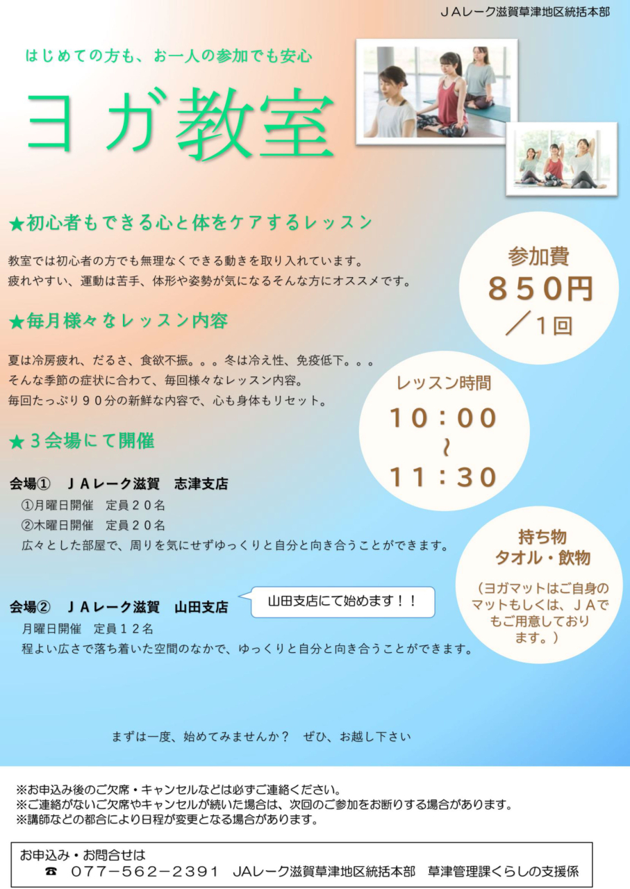 【草津地区】参加者募集!! ヨガ教室/次回は3月19日開催