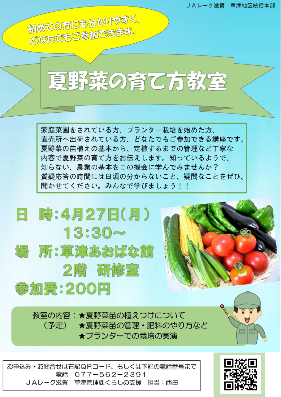【草津地区】参加者募集!! 「夏野菜の育て方教室」/4月27日(月)