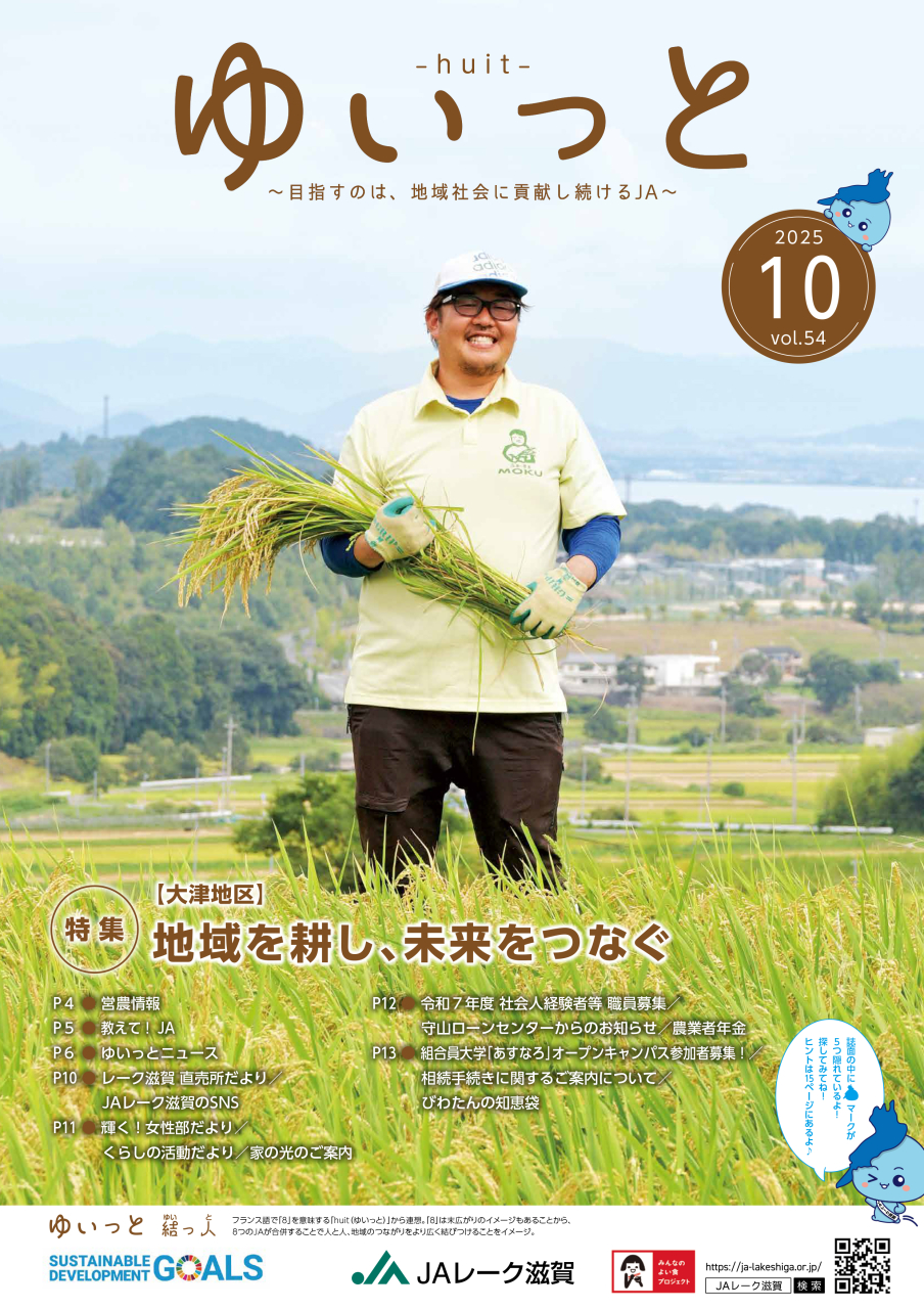 JAレーク滋賀の広報誌『ゆいっと』(組合員向け)、『JAレーク滋賀通信』(地域向け)をご覧いただけます。 キャンペーンやイベントのご案内のほか、トピックスや特集記事など、情報をたくさん詰めこんでお届けいたします。